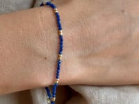 Golden SummerScape - Lapis - vibe-ul de vacanță vine cu tine pretutindeni ori de câte ori porți această bijuterie. Brățara are lungimea de 16 cm, cu posibilitatea de a fi extinsă până la 19 cm. Înălțimea pietrelor naturale de Lapis este de 2.5 mm, iar placajul folosit este de Aur Galben 14K cu grosimea de 2 microni.