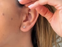 Designul floral este compus dintr-o piatră centrală înconjurată de cinci pietre mai mici, creând un efect vizual simetric și delicat. Dimensiunile de 5 mm și greutatea de doar 0,5 g îi fac extrem de confortabili pentru purtarea zilnică.