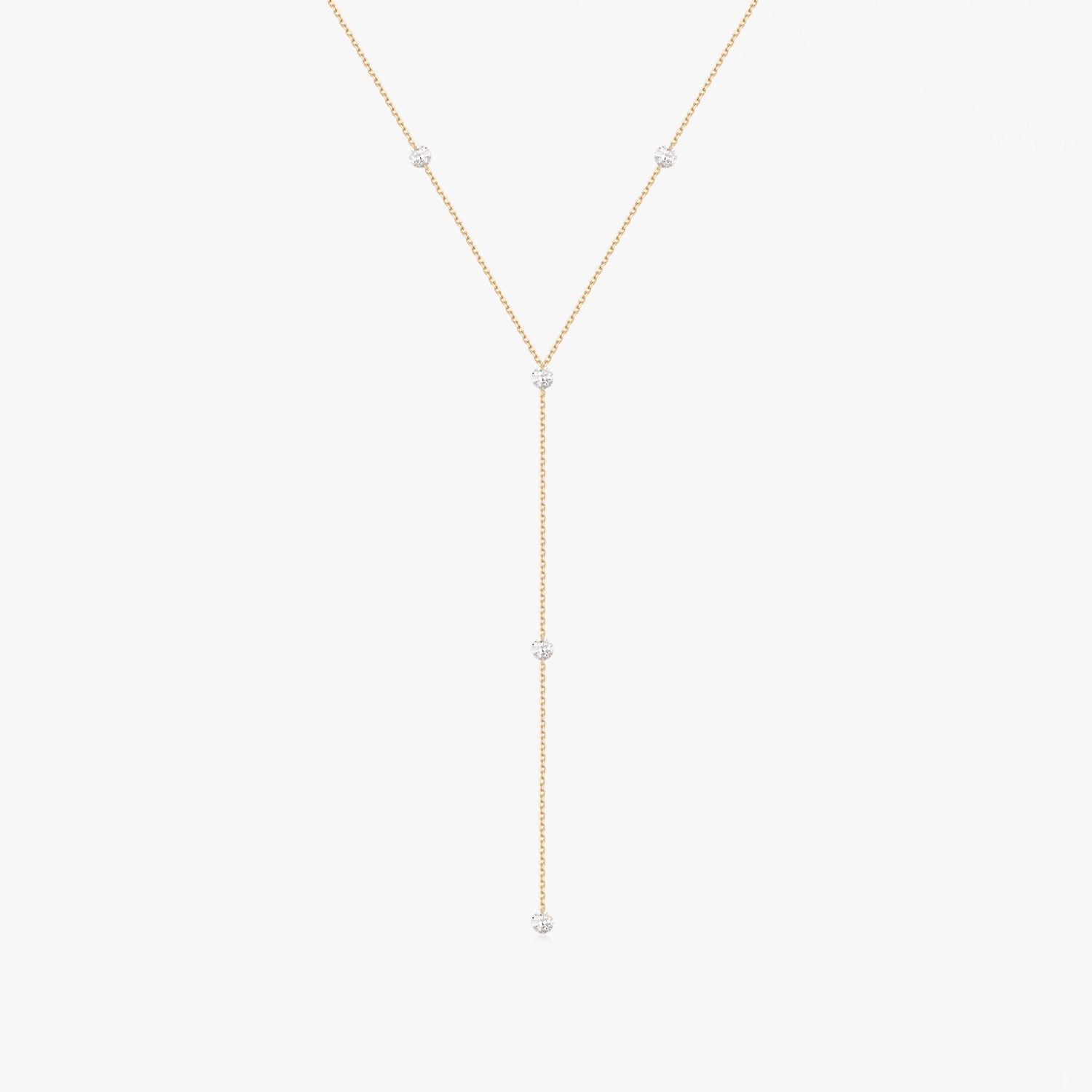Un colier lariat din aur de 14K, cu diamante de laborator de 4 mm care cad delicat și pun în evidență decolteul. O reinterpretare a clasicului colier lariat, sub o forma mai elegantă, ce poate fi combinată și cu alte coliere la baza gâtului.