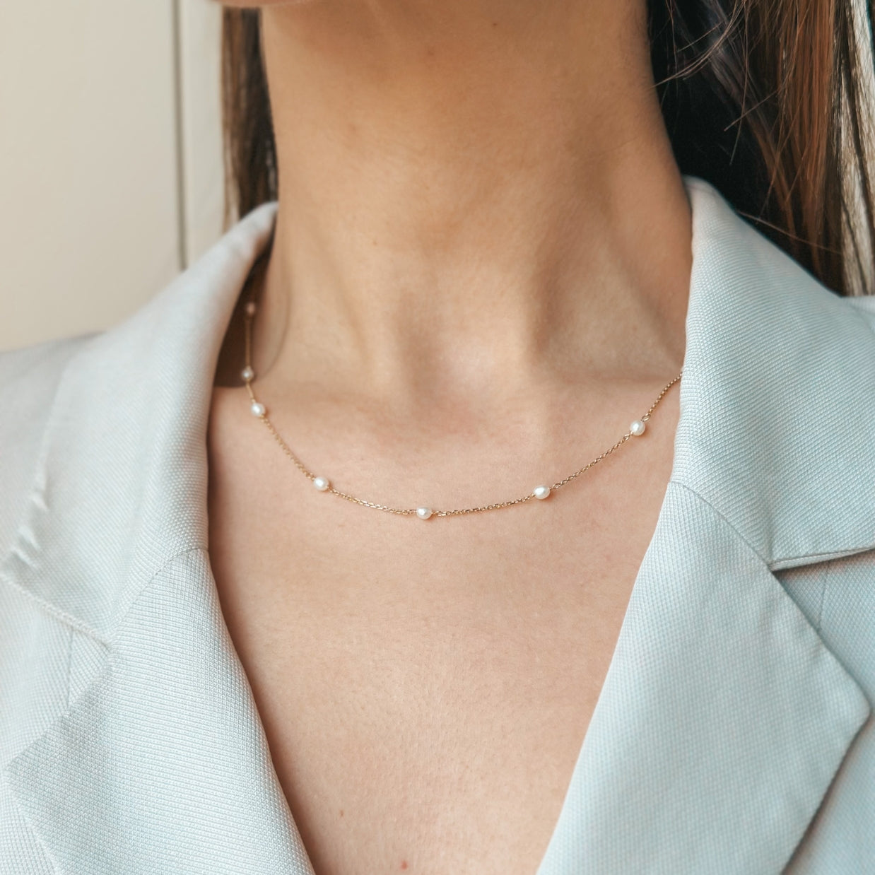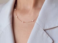 Acest colier rafinat din aur galben de 14K combină finețea lanțului delicat cu farmecul perlelor subtile, oferind o eleganță naturală și sofisticată. Designul minimalist și dispunerea uniformă a perlelor îl fac o alegere perfectă pentru a completa ținute elegante sau casual, adăugând o notă de stil feminin și grațios.