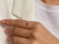 Precious cu piatră de ametist și zirconii, pe cât de delicat, pe atât de surprinzător. Piatra din ametist masoară 5x2.5 mm, iar grosimea inelului este de 1.5 mm.