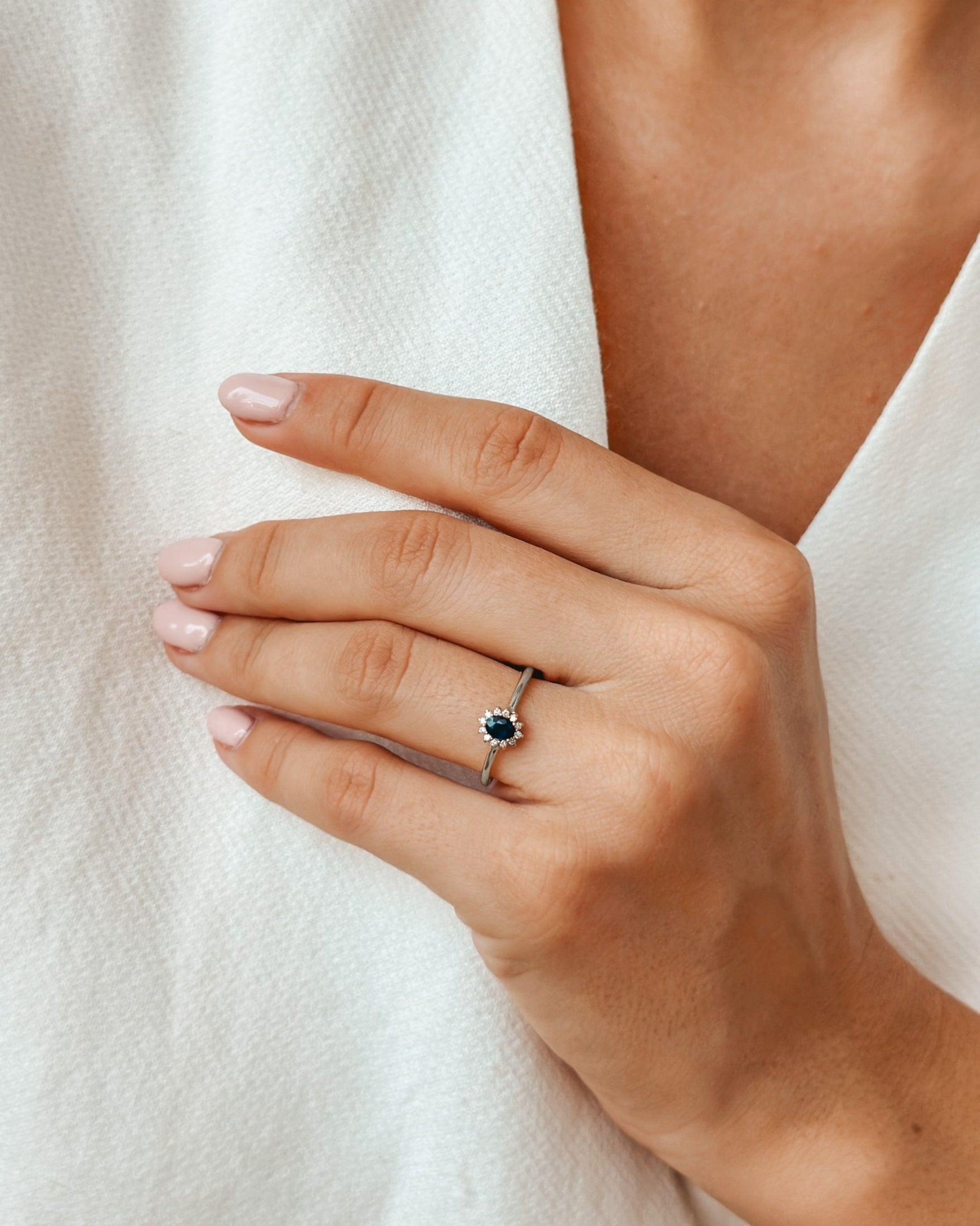 Un inel clasic cu o notă regală, realizat din aur alb de 14K și decorat cu un safir oval intens, înconjurat de diamante rotunde ce însumează 0.06 ct