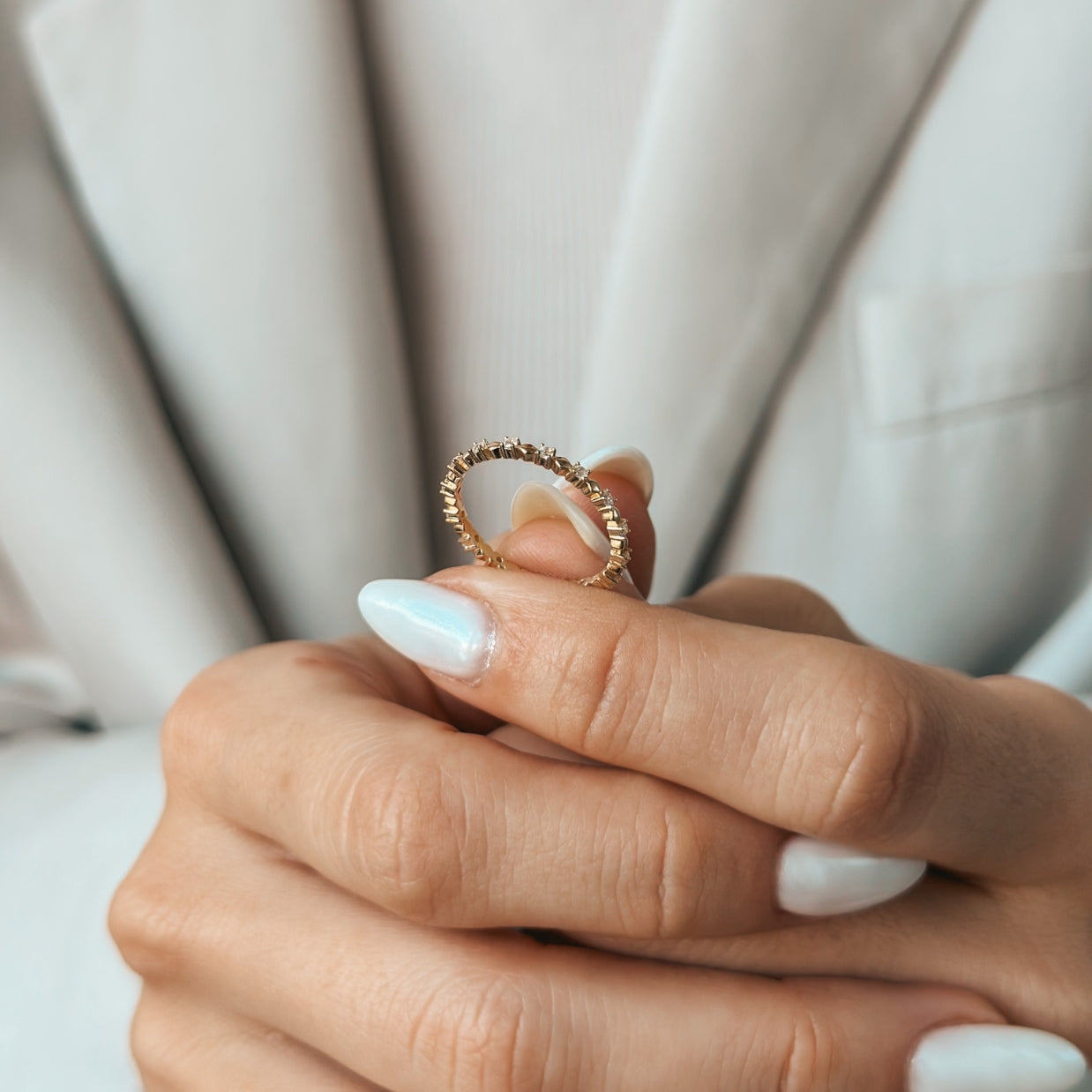 Acest inel delicat și elegant din aur galben de 14K este decorat cu zirconii strălucitoare, dispuse armonios de-a lungul întregului cerc. Designul său rafinat și detaliile impecabile îl transformă într-un simbol al iubirii și al eleganței. Potrivit atât pentru ocazii speciale, cât și pentru purtarea zilnică, acest inel adaugă un plus de strălucire și rafinament oricărei ținute.